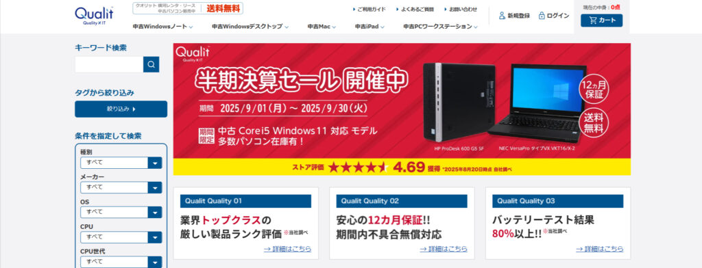 【PR】Qualit みなさんこんにちは最近、パソコンも結構なお値段しますよね…。もう古くなったのでそろそろ買い換えたい、でもそんなにお金はかけたくないという方必見です!!特に中古でも気にしない方はお安く良いパソコンが手に入るチャンスおすすめポイントレンタル資産を、レンタル満了後に販売する中古パソコン店です。社内の検査・清掃ラインにて、厳正なチェックを行いランク判定を行っていますが、非常に厳しくチェックを行っているため、購入されたお客様から「どこに傷があるかわからない」「新品と変わらない」といった高い評価を得ているそうです♪さらに、価格は常に安値を目指し販売していますので、掘り出しものが多く出品されるのも特徴の一つです。しかも12カ月保証で販売されているのも人気の理由主な商品ラインナップ・初心者用・学生用・ビジネス用・低価格・高性能パソコン・高品質パソコン主要メーカーを多数取り揃えられています!定期的にセールも行っているので、掘り出し物が見つかるチャンスかも✨ 詳しくはこちらをクリック おすすめ商品 Latitude 7390(Win11x64)中古 Core i5-1.6GHz(8250U)/メモリ16GB/SSD256GB/フルHD13.3インチ/Webカメラ[訳あり品] 2019年頃購入 34,100円 外観がランク基準外ですが、動作は正常確認済!※ 保証期間は出荷日から起算して10日間です。WPS Office 2 Standard,ACアダプタ,電源コードの付属品付き✨ ThinkPad X1 CarbonGen8(Win11x64) 中古 Core i5-1.7GHz(10310U)/メモリ8GB/SSD256GB/フルHD14インチ/Webカメラ [C:並品] 2020年頃購入 41,800円 きれい・安い!12ヵ月保証付き!バッテリーテスト結果80%以上の商品です。Win11にも対応可⭐WPS Office 2 Standard,ACアダプタ,電源コードの付属品も付いてきます! おすすめ情報 商材名 Qualit運営者 A.W※当サイトはアフィリエイトプログラムを利用し宣伝目的で作成しております。